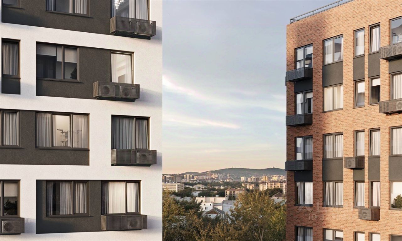 Ламинированные окна графитового цвета гармонично вписываются в общий стиль, а продуманные корзины для кондиционеров сохраняют эстетику фасадов.