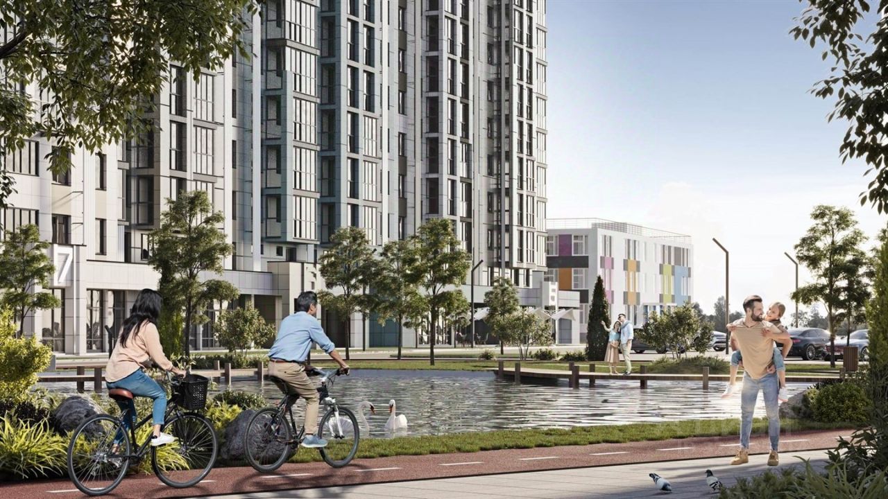 Более 20 000 м² зелёных зон с продуманным ландшафтом, искусственным водоёмом, зонами отдыха, прогулочными дорожками и местами для общения создают атмосферу уюта и спокойствия.