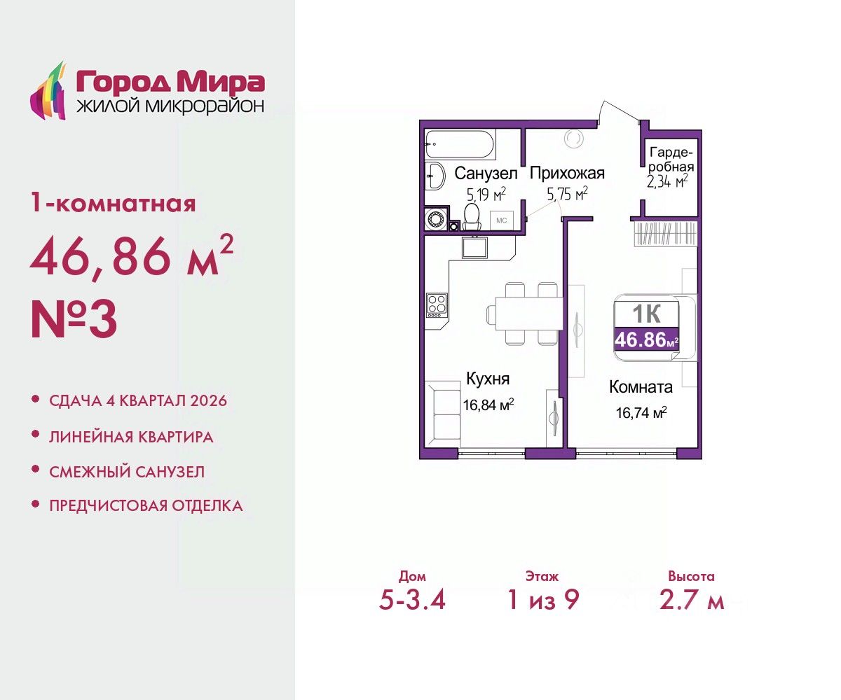 1-комн. квартира с предчистовой отделкой в ЖМ "Город Мира" на 1 этаже. Общая площадь: 46.86 кв.м., жилая: 16.74 кв.м., площадь просторной кухни-столовой: 16.84 кв.м. Все окна выходят на одну сторону. В квартире один совмещенный санузел. Высота потолков 2.7 м.