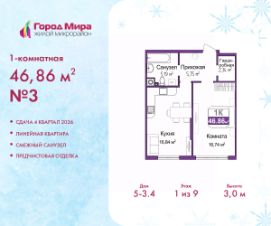 Продается однокомнатная квартира от застройщика с предчистовой отделкой в ЖМ "Город Мира" на 1 этаже. Общая площадь: 46.86 кв.м., жилая: 16.74 кв.м., площадь просторной кухни-столовой: 16.84 кв.м. Все окна выходят на одну сторону. В квартире один совмещенный санузел. Высота потолков 3,0 м.