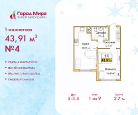 Однокомнатная квартира от застройщика с предчистовой отделкой в ЖМ "Город Мира" на 1 этаже. Общая площадь: 43.91 кв.м., жилая: 14.4 кв.м., площадь просторной кухни-столовой: 18.21 кв.м. Все окна выходят на одну сторону. В квартире один совмещенный санузел. Высота потолков 2.7 м.