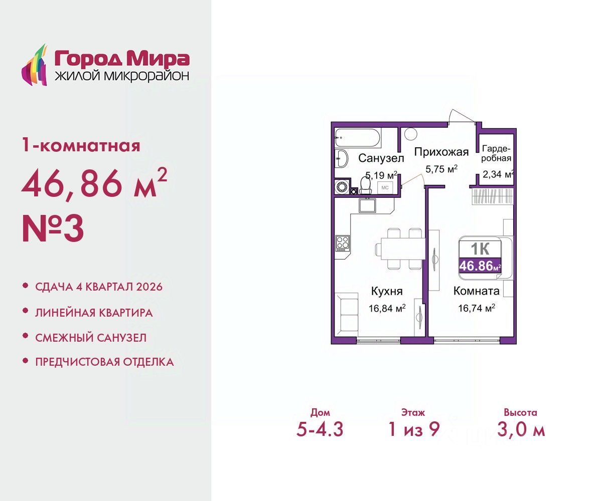 Просторная 1-комн. квартира с предчистовой отделкой в ЖМ "Город Мира" на 1 этаже. Общая площадь: 46.86 кв.м., жилая: 16.74 кв.м., площадь просторной кухни-столовой: 16.84 кв.м. Все окна выходят на одну сторону. В квартире один совмещенный санузел. Высота потолков 3,0 м.