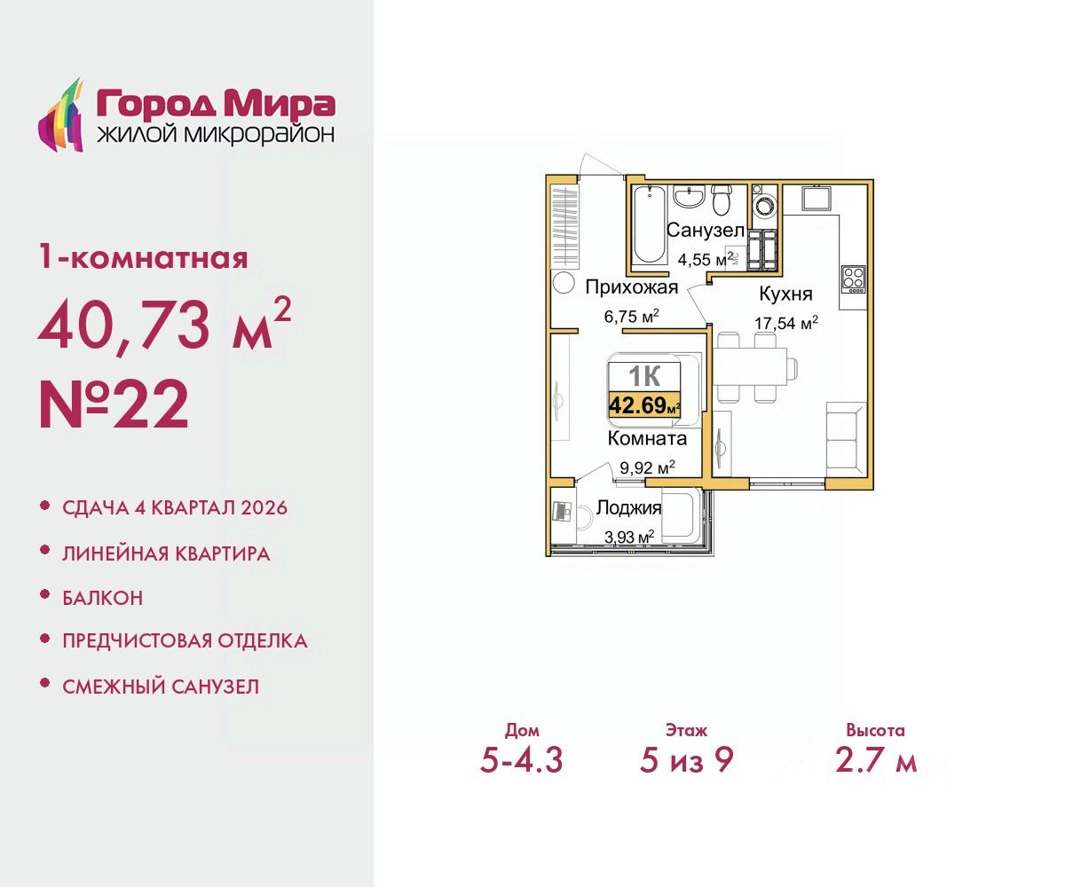 1-комн. квартира от застройщика с предчистовой отделкой в ЖМ "Город Мира" на 5 этаже. Общая площадь: 40.73 кв.м., жилая: 9.92 кв.м., площадь просторной кухни-столовой: 17.54 кв.м. Все окна выходят на одну сторону. В квартире один балкон, один совмещенный санузел. Высота потолков 2.7 м.