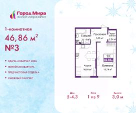 1-комн. квартира с предчистовой отделкой в ЖМ "Город Мира" на 1 этаже. Общая площадь: 46.86 кв.м., жилая: 16.74 кв.м., площадь просторной кухни-столовой: 16.84 кв.м. Все окна выходят на одну сторону. В квартире один совмещенный санузел. Высота потолков 3,0 м.