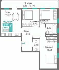 Продаётся 3-комнатная квартира в строящемся доме (Дом 2 (Секции Т2.1, Т2, К3КП1)), срок сдачи: I-кв. 2029, общей площадью 66.78 кв.м., на 9 этаже. Новый жилой комплекс "Благо" от застройщика "Монолит" расположен по адресу: Республика Крым, Симферопольский район, село Перово