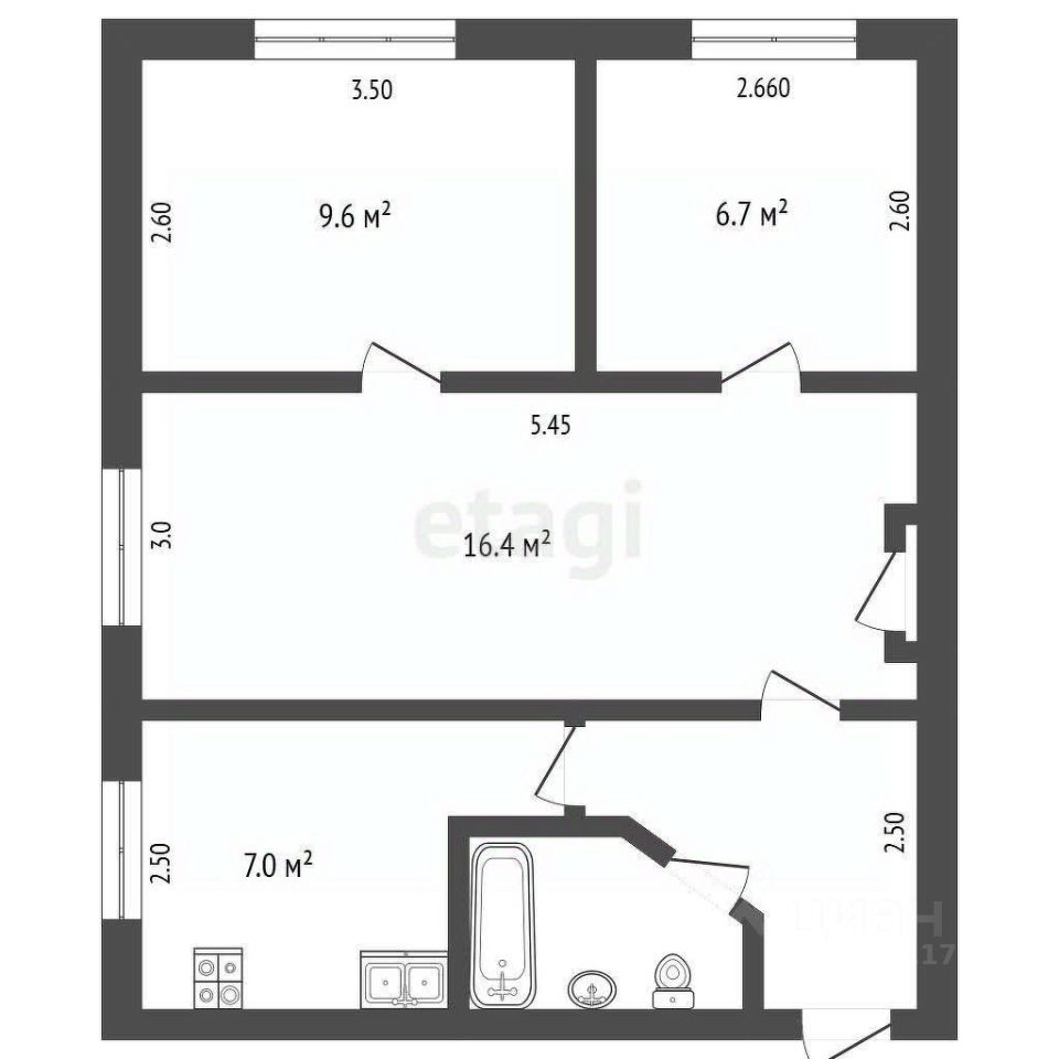 2 изолированные спальни и гостиную, которая служит проходным помещением. Высота потолков — 2,4 м, окна выходят во двор.