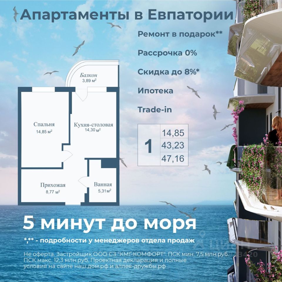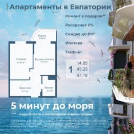 АКЦИИ: * Ипотека от 40 000 руб. в месяц * Рассрочка 0% до 2028г. * Бронь на 30 дней * 5 мин до моря пешком, планировки от 30 кв.м. * Высота потолков 3 м , предчистовая и чистовая отделка * Доходность инвестиций от 40% годовых. * Сдача в аренду от управляющей компании (доверительное управление) позволяет получать доход от сдачи апартаментов без вашего участия * Безопасная сделка по ФЗ-214/эскроу-счёта "Аллея Дружбы" — это комплекс апартаментов бизнес-класса в Евпатории, расположенный в 5 минутах прогулки от золотистых пляжей Чёрного моря. Два современных 12-этажных корпуса с панорамными видами на море объединены стильным стилобатом с центральным входом и бутиковыми retail-площадями, а закрытая территория и подземный паркинг обеспечивает приватность и безопасность. АРХИТЕКТУРА И КОНСТРУКТИВНЫЕ ОСОБЕННОСТИ: • 12-этажное здание в авторском архитектурном стиле • Высота потолков (от 2,9 м до 3,1 м) • Эксклюзивное решение для первых этажей (высота потолков 3,4м) • Евро планировки с террасами и гардеробными • Панорамное ламинированное остекление • Индивидуальные келлеры • Видовые лоты на море • Высокоскоростные лифты по концепции 5* отеля • Предусмотрено резервное электроснабжение • По проекту предусмотрено место для кондиционера и практическое решение для маскировки коммуникаций ЛОКАЦИЯ И ОКРУЖЕНИЕ: • До центра Евпатории - 7 минут на машине • Пляж - всего 5 минут пешком • Рядом с комплексом развитая инфраструктура (рестораны, магазины, кафе, медицинские учреждения, санатории) ГОСТЕПРИИМСТВО И БЕЗУПРЕЧНЫЕ СЕРВИСЫ: • Управляющая компания премиум-класса • Консъерж-сервис 24/7 • Доставки продуктов и готовой еды • Зона ресепшн оформлена в стилистике комплекса • Лобби с атмосферным кафе и зонами для чтения • Премиальное решение для мест общего пользования • Интерактивная детская комната для самых маленьких • Пункты выдачи товаров от маркетплейсов • Гостевые парковочные места • Организовано место для хранения колясок ваших малышей • Ремонт на выбор "Комфорт-формат" и "Гранд-формат" БЕЗОПАСНОСТЬ И ТЕХНОЛОГИИ СПОКОЙСТВИЯ: • Закрытая территория, двор без машин • Система контроля доступа (строго по электронным пропускам) • Подземный паркинг с тремя типами машиномест • Выделенные места для велосипедов • Камеры видеонаблюдения • Круглосуточный ресепшн • Телеметрия - автоматический сбор и передача данных с приборов учета апартамента минимизирует ошибки и мошенничество • Система умного апартамента с дистанционным управлением БЛАГОУСТРОЙСТВО ТЕРРИТОРИИ: • Ландшафтный дизайн по проекту (2 334 м² озеленения) • Прогулочные аллеи и зоны отдыха для расслабления и медитации • Коворкинг-зоны с высокоскоростным Wi-Fi для бизнес-переговоров • Детские и спортивные площадки • В апарт-комплексе вас ждут мини-маркет и магазин повседневных товаров • Специальное пространство для курения • Выделенная площадка для игры в волейбол и баскетбол РЕЛАКС И ДОСУГ: • На территории комплекса 2 отдельных бассейна: летний бассейн с выделенной зоной для детей и крытый те