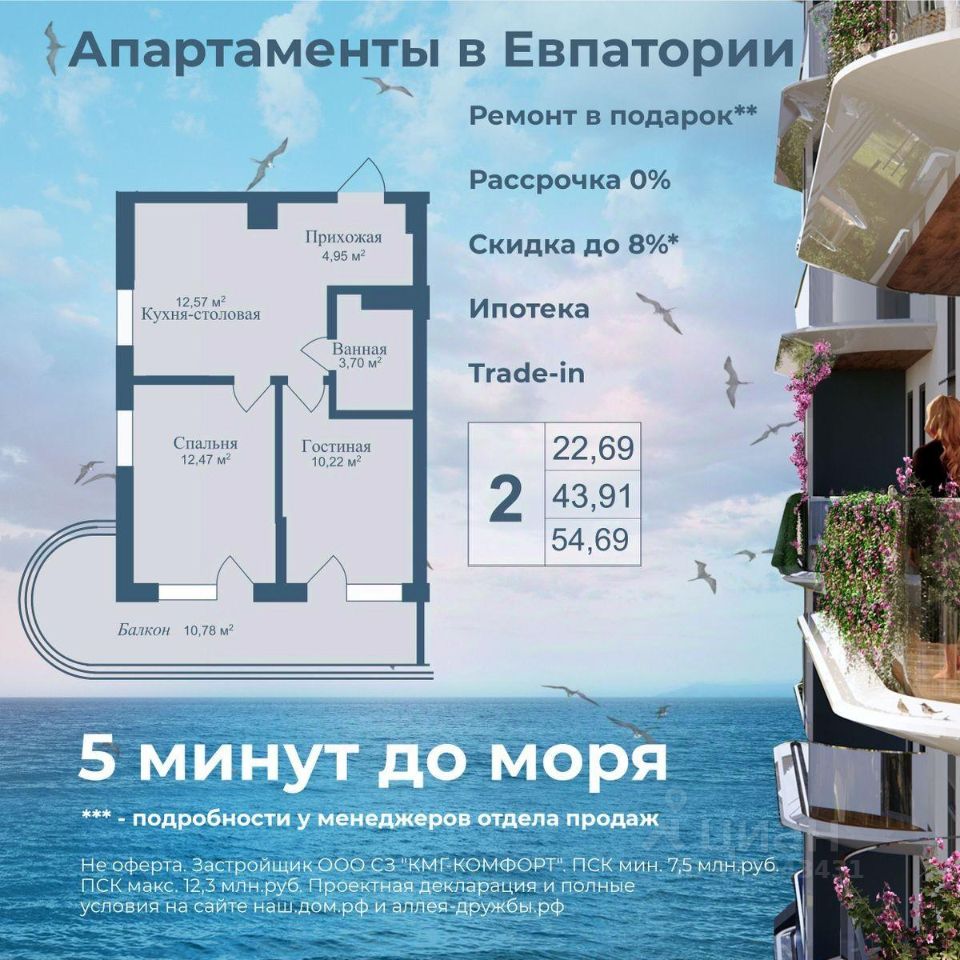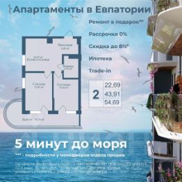 АКЦИИ: * Ипотека от 40 000 руб. в месяц * Рассрочка 0% до 2028г. * Бронь на 30 дней * 5 мин до моря пешком, планировки от 30 кв.м. * Высота потолков 3 м , предчистовая и чистовая отделка * Доходность инвестиций от 40% годовых. * Сдача в аренду от управляющей компании (доверительное управление) позволяет получать доход от сдачи апартаментов без вашего участия * Безопасная сделка по ФЗ-214/эскроу-счёта "Аллея Дружбы" — это комплекс апартаментов бизнес-класса в Евпатории, расположенный в 5 минутах прогулки от золотистых пляжей Чёрного моря. Два современных 12-этажных корпуса с панорамными видами на море объединены стильным стилобатом с центральным входом и бутиковыми retail-площадями, а закрытая территория и подземный паркинг обеспечивает приватность и безопасность. АРХИТЕКТУРА И КОНСТРУКТИВНЫЕ ОСОБЕННОСТИ: • 12-этажное здание в авторском архитектурном стиле • Высота потолков (от 2,9 м до 3,1 м) • Эксклюзивное решение для первых этажей (высота потолков 3,4м) • Евро планировки с террасами и гардеробными • Панорамное ламинированное остекление • Индивидуальные келлеры • Видовые лоты на море • Высокоскоростные лифты по концепции 5* отеля • Предусмотрено резервное электроснабжение • По проекту предусмотрено место для кондиционера и практическое решение для маскировки коммуникаций ЛОКАЦИЯ И ОКРУЖЕНИЕ: • До центра Евпатории - 7 минут на машине • Пляж - всего 5 минут пешком • Рядом с комплексом развитая инфраструктура (рестораны, магазины, кафе, медицинские учреждения, санатории) ГОСТЕПРИИМСТВО И БЕЗУПРЕЧНЫЕ СЕРВИСЫ: • Управляющая компания премиум-класса • Консъерж-сервис 24/7 • Доставки продуктов и готовой еды • Зона ресепшн оформлена в стилистике комплекса • Лобби с атмосферным кафе и зонами для чтения • Премиальное решение для мест общего пользования • Интерактивная детская комната для самых маленьких • Пункты выдачи товаров от маркетплейсов • Гостевые парковочные места • Организовано место для хранения колясок ваших малышей • Ремонт на выбор "Комфорт-формат" и "Гранд-формат" БЕЗОПАСНОСТЬ И ТЕХНОЛОГИИ СПОКОЙСТВИЯ: • Закрытая территория, двор без машин • Система контроля доступа (строго по электронным пропускам) • Подземный паркинг с тремя типами машиномест • Выделенные места для велосипедов • Камеры видеонаблюдения • Круглосуточный ресепшн • Телеметрия - автоматический сбор и передача данных с приборов учета апартамента минимизирует ошибки и мошенничество • Система умного апартамента с дистанционным управлением БЛАГОУСТРОЙСТВО ТЕРРИТОРИИ: • Ландшафтный дизайн по проекту (2 334 м² озеленения) • Прогулочные аллеи и зоны отдыха для расслабления и медитации • Коворкинг-зоны с высокоскоростным Wi-Fi для бизнес-переговоров • Детские и спортивные площадки • В апарт-комплексе вас ждут мини-маркет и магазин повседневных товаров • Специальное пространство для курения • Выделенная площадка для игры в волейбол и баскетбол РЕЛАКС И ДОСУГ: • На территории комплекса 2 отдельных бассейна: летний бассейн с выделенной зоной для детей и крытый те