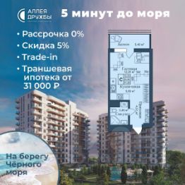 ЗВОНИТЕ ПРЯМО СЕЙЧАС, ЧТОБЫ ПОЛУЧИТЬ ВЫГОДУ ДО 650 000 руб! Цена указана со скидкой 5% при условии 100% оплаты либо ипотека. АКЦИИ: * Ипотека от 14,7% * ТРАНШЕВАЯ ИПОТЕКА - ПВ от 20%, платежи от 31000 в месяц * Рассрочка 0% до 2028г. ПВ от 20% * Скидка 5% * Бронь на 30 дней * 5 мин до моря пешком, планировки от 30 кв.м. * Высота потолков 3 м , предчистовая и чистовая отделка * Ипотека от СБЕРБАНКА * Доходность инвестиций от 30% годовых. * Сдача в аренду от управляющей компании (доверительное управление) позволяет получать доход от сдачи апартаментов без вашего участия * Безопасная сделка по ФЗ-214/эскроу-счёта "Аллея Дружбы" — это комплекс апартаментов бизнес-класса в Евпатории, расположенный в 5 минутах прогулки от золотистых пляжей Чёрного моря. Два современных 12-этажных корпуса с панорамными видами на море объединены стильным стилобатом с центральным входом и бутиковыми retail-площадями, а закрытая территория и подземный паркинг обеспечивает приватность и безопасность. АРХИТЕКТУРА И КОНСТРУКТИВНЫЕ ОСОБЕННОСТИ: • 12-этажное здание в авторском архитектурном стиле • Высота потолков (от 2,9 м до 3,1 м) • Эксклюзивное решение для первых этажей (высота потолков 3,4м) • Евро планировки с террасами и гардеробными • Панорамное ламинированное остекление • Индивидуальные келлеры • Видовые лоты на море • Высокоскоростные лифты по концепции 5* отеля • Предусмотрено резервное электроснабжение • По проекту предусмотрено место для кондиционера и практическое решение для маскировки коммуникаций ЛОКАЦИЯ И ОКРУЖЕНИЕ: • До центра Евпатории - 7 минут на машине • Пляж - всего 5 минут пешком • Рядом с комплексом развитая инфраструктура (рестораны, магазины, кафе, медицинские учреждения, санатории) ГОСТЕПРИИМСТВО И БЕЗУПРЕЧНЫЕ СЕРВИСЫ: • Управляющая компания премиум-класса • Консъерж-сервис 24/7 • Доставки продуктов и готовой еды • Зона ресепшн оформлена в стилистике комплекса • Лобби с атмосферным кафе и зонами для чтения • Премиальное решение для мест общего пользования • Интерактивная детская комната для самых маленьких • Пункты выдачи товаров от маркетплейсов • Гостевые парковочные места • Организовано место для хранения колясок ваших малышей • Ремонт на выбор "Комфорт-формат" и "Гранд-формат" БЕЗОПАСНОСТЬ И ТЕХНОЛОГИИ СПОКОЙСТВИЯ: • Закрытая территория, двор без машин • Система контроля доступа (строго по электронным пропускам) • Подземный паркинг с тремя типами машиномест • Выделенные места для велосипедов • Камеры видеонаблюдения • Круглосуточный ресепшн • Телеметрия - автоматический сбор и передача данных с приборов учета апартамента минимизирует ошибки и мошенничество • Система умного апартамента с дистанционным управлением БЛАГОУСТРОЙСТВО ТЕРРИТОРИИ: • Ландшафтный дизайн по проекту (2 334 м² озеленения) • Прогулочные аллеи и зоны отдыха для расслабления и медитации • Коворкинг-зоны с высокоскоростным Wi-Fi для бизнес-переговоров • Детские и спортивные площадки • В апарт-комплексе вас ждут мини-маркет и магазин повседневных товаров
