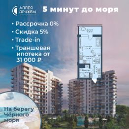 ЗВОНИТЕ ПРЯМО СЕЙЧАС, ЧТОБЫ ПОЛУЧИТЬ ВЫГОДУ ДО 650 000 руб! АКЦИИ: * Ипотека от 14,7% * ТРАНШЕВАЯ ИПОТЕКА - ПВ от 20%, платежи от 31000 в месяц * Рассрочка 0% до 2028г. ПВ от 20% * Скидка 5% * Бронь на 30 дней * 5 мин до моря пешком, планировки от 30 кв.м. * Высота потолков 3 м , предчистовая и чистовая отделка * Ипотека от СБЕРБАНКА * Доходность инвестиций от 30% годовых. * Сдача в аренду от управляющей компании (доверительное управление) позволяет получать доход от сдачи апартаментов без вашего участия * Безопасная сделка по ФЗ-214/эскроу-счёта "Аллея Дружбы" — это комплекс апартаментов бизнес-класса в Евпатории, расположенный в 5 минутах прогулки от золотистых пляжей Чёрного моря. Два современных 12-этажных корпуса с панорамными видами на море объединены стильным стилобатом с центральным входом и бутиковыми retail-площадями, а закрытая территория и подземный паркинг обеспечивает приватность и безопасность. АРХИТЕКТУРА И КОНСТРУКТИВНЫЕ ОСОБЕННОСТИ: • 12-этажное здание в авторском архитектурном стиле • Высота потолков (от 2,9 м до 3,1 м) • Эксклюзивное решение для первых этажей (высота потолков 3,4м) • Евро планировки с террасами и гардеробными • Панорамное ламинированное остекление • Индивидуальные келлеры • Видовые лоты на море • Высокоскоростные лифты по концепции 5* отеля • Предусмотрено резервное электроснабжение • По проекту предусмотрено место для кондиционера и практическое решение для маскировки коммуникаций ЛОКАЦИЯ И ОКРУЖЕНИЕ: • До центра Евпатории - 7 минут на машине • Пляж - всего 5 минут пешком • Рядом с комплексом развитая инфраструктура (рестораны, магазины, кафе, медицинские учреждения, санатории) ГОСТЕПРИИМСТВО И БЕЗУПРЕЧНЫЕ СЕРВИСЫ: • Управляющая компания премиум-класса • Консъерж-сервис 24/7 • Доставки продуктов и готовой еды • Зона ресепшн оформлена в стилистике комплекса • Лобби с атмосферным кафе и зонами для чтения • Премиальное решение для мест общего пользования • Интерактивная детская комната для самых маленьких • Пункты выдачи товаров от маркетплейсов • Гостевые парковочные места • Организовано место для хранения колясок ваших малышей • Ремонт на выбор "Комфорт-формат" и "Гранд-формат" БЕЗОПАСНОСТЬ И ТЕХНОЛОГИИ СПОКОЙСТВИЯ: • Закрытая территория, двор без машин • Система контроля доступа (строго по электронным пропускам) • Подземный паркинг с тремя типами машиномест • Выделенные места для велосипедов • Камеры видеонаблюдения • Круглосуточный ресепшн • Телеметрия - автоматический сбор и передача данных с приборов учета апартамента минимизирует ошибки и мошенничество • Система умного апартамента с дистанционным управлением БЛАГОУСТРОЙСТВО ТЕРРИТОРИИ: • Ландшафтный дизайн по проекту (2 334 м² озеленения) • Прогулочные аллеи и зоны отдыха для расслабления и медитации • Коворкинг-зоны с высокоскоростным Wi-Fi для бизнес-переговоров • Детские и спортивные площадки • В апарт-комплексе вас ждут мини-маркет и магазин повседневных товаров • Специальное пространство для курения • Выделенная площадка для