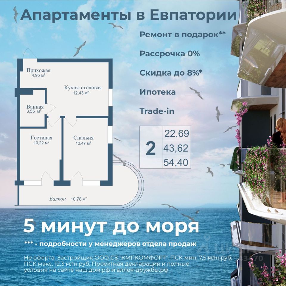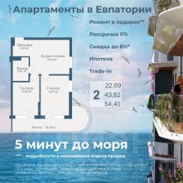 АКЦИИ: * Ипотека от 40 000 руб. в месяц * Рассрочка 0% до 2028г. * Бронь на 30 дней * 5 мин до моря пешком, планировки от 30 кв.м. * Высота потолков 3 м , предчистовая и чистовая отделка * Доходность инвестиций от 40% годовых. * Сдача в аренду от управляющей компании (доверительное управление) позволяет получать доход от сдачи апартаментов без вашего участия * Безопасная сделка по ФЗ-214/эскроу-счёта "Аллея Дружбы" — это комплекс апартаментов бизнес-класса в Евпатории, расположенный в 5 минутах прогулки от золотистых пляжей Чёрного моря. Два современных 12-этажных корпуса с панорамными видами на море объединены стильным стилобатом с центральным входом и бутиковыми retail-площадями, а закрытая территория и подземный паркинг обеспечивает приватность и безопасность. АРХИТЕКТУРА И КОНСТРУКТИВНЫЕ ОСОБЕННОСТИ: • 12-этажное здание в авторском архитектурном стиле • Высота потолков (от 2,9 м до 3,1 м) • Эксклюзивное решение для первых этажей (высота потолков 3,4м) • Евро планировки с террасами и гардеробными • Панорамное ламинированное остекление • Индивидуальные келлеры • Видовые лоты на море • Высокоскоростные лифты по концепции 5* отеля • Предусмотрено резервное электроснабжение • По проекту предусмотрено место для кондиционера и практическое решение для маскировки коммуникаций ЛОКАЦИЯ И ОКРУЖЕНИЕ: • До центра Евпатории - 7 минут на машине • Пляж - всего 5 минут пешком • Рядом с комплексом развитая инфраструктура (рестораны, магазины, кафе, медицинские учреждения, санатории) ГОСТЕПРИИМСТВО И БЕЗУПРЕЧНЫЕ СЕРВИСЫ: • Управляющая компания премиум-класса • Консъерж-сервис 24/7 • Доставки продуктов и готовой еды • Зона ресепшн оформлена в стилистике комплекса • Лобби с атмосферным кафе и зонами для чтения • Премиальное решение для мест общего пользования • Интерактивная детская комната для самых маленьких • Пункты выдачи товаров от маркетплейсов • Гостевые парковочные места • Организовано место для хранения колясок ваших малышей • Ремонт на выбор "Комфорт-формат" и "Гранд-формат" БЕЗОПАСНОСТЬ И ТЕХНОЛОГИИ СПОКОЙСТВИЯ: • Закрытая территория, двор без машин • Система контроля доступа (строго по электронным пропускам) • Подземный паркинг с тремя типами машиномест • Выделенные места для велосипедов • Камеры видеонаблюдения • Круглосуточный ресепшн • Телеметрия - автоматический сбор и передача данных с приборов учета апартамента минимизирует ошибки и мошенничество • Система умного апартамента с дистанционным управлением БЛАГОУСТРОЙСТВО ТЕРРИТОРИИ: • Ландшафтный дизайн по проекту (2 334 м² озеленения) • Прогулочные аллеи и зоны отдыха для расслабления и медитации • Коворкинг-зоны с высокоскоростным Wi-Fi для бизнес-переговоров • Детские и спортивные площадки • В апарт-комплексе вас ждут мини-маркет и магазин повседневных товаров • Специальное пространство для курения • Выделенная площадка для игры в волейбол и баскетбол РЕЛАКС И ДОСУГ: • На территории комплекса 2 отдельных бассейна: летний бассейн с выделенной зоной для детей и крытый те