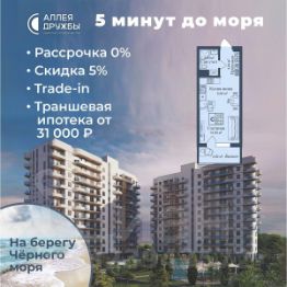 ЗВОНИТЕ ПРЯМО СЕЙЧАС, ЧТОБЫ ПОЛУЧИТЬ ВЫГОДУ ДО 650 000 руб! Цена указана со скидкой 5% при условии 100% оплаты либо ипотека. АКЦИИ: * Ипотека от 14,7% * ТРАНШЕВАЯ ИПОТЕКА - ПВ от 20%, платежи от 31000 в месяц * Рассрочка 0% до 2028г. ПВ от 20% * Скидка 5% * Бронь на 30 дней * 5 мин до моря пешком, планировки от 30 кв.м. * Высота потолков 3 м , предчистовая и чистовая отделка * Ипотека от СБЕРБАНКА * Доходность инвестиций от 30% годовых. * Сдача в аренду от управляющей компании (доверительное управление) позволяет получать доход от сдачи апартаментов без вашего участия * Безопасная сделка по ФЗ-214/эскроу-счёта "Аллея Дружбы" — это комплекс апартаментов бизнес-класса в Евпатории, расположенный в 5 минутах прогулки от золотистых пляжей Чёрного моря. Два современных 12-этажных корпуса с панорамными видами на море объединены стильным стилобатом с центральным входом и бутиковыми retail-площадями, а закрытая территория и подземный паркинг обеспечивает приватность и безопасность. АРХИТЕКТУРА И КОНСТРУКТИВНЫЕ ОСОБЕННОСТИ: • 12-этажное здание в авторском архитектурном стиле • Высота потолков (от 2,9 м до 3,1 м) • Эксклюзивное решение для первых этажей (высота потолков 3,4м) • Евро планировки с террасами и гардеробными • Панорамное ламинированное остекление • Индивидуальные келлеры • Видовые лоты на море • Высокоскоростные лифты по концепции 5* отеля • Предусмотрено резервное электроснабжение • По проекту предусмотрено место для кондиционера и практическое решение для маскировки коммуникаций ЛОКАЦИЯ И ОКРУЖЕНИЕ: • До центра Евпатории - 7 минут на машине • Пляж - всего 5 минут пешком • Рядом с комплексом развитая инфраструктура (рестораны, магазины, кафе, медицинские учреждения, санатории) ГОСТЕПРИИМСТВО И БЕЗУПРЕЧНЫЕ СЕРВИСЫ: • Управляющая компания премиум-класса • Консъерж-сервис 24/7 • Доставки продуктов и готовой еды • Зона ресепшн оформлена в стилистике комплекса • Лобби с атмосферным кафе и зонами для чтения • Премиальное решение для мест общего пользования • Интерактивная детская комната для самых маленьких • Пункты выдачи товаров от маркетплейсов • Гостевые парковочные места • Организовано место для хранения колясок ваших малышей • Ремонт на выбор "Комфорт-формат" и "Гранд-формат" БЕЗОПАСНОСТЬ И ТЕХНОЛОГИИ СПОКОЙСТВИЯ: • Закрытая территория, двор без машин • Система контроля доступа (строго по электронным пропускам) • Подземный паркинг с тремя типами машиномест • Выделенные места для велосипедов • Камеры видеонаблюдения • Круглосуточный ресепшн • Телеметрия - автоматический сбор и передача данных с приборов учета апартамента минимизирует ошибки и мошенничество • Система умного апартамента с дистанционным управлением БЛАГОУСТРОЙСТВО ТЕРРИТОРИИ: • Ландшафтный дизайн по проекту (2 334 м² озеленения) • Прогулочные аллеи и зоны отдыха для расслабления и медитации • Коворкинг-зоны с высокоскоростным Wi-Fi для бизнес-переговоров • Детские и спортивные площадки • В апарт-комплексе вас ждут мини-маркет и магазин повседневных товаров