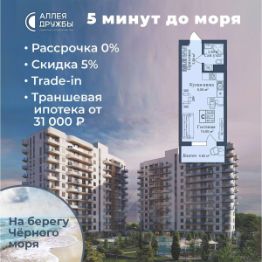 ЗВОНИТЕ ПРЯМО СЕЙЧАС, ЧТОБЫ ПОЛУЧИТЬ ВЫГОДУ ДО 650 000 руб! Цена указана со скидкой 5% при условии 100% оплаты либо ипотека. АКЦИИ: * Ипотека от 14,7% * ТРАНШЕВАЯ ИПОТЕКА - ПВ от 20%, платежи от 31000 в месяц * Рассрочка 0% до 2028г. ПВ от 20% * Скидка 5% * Бронь на 30 дней * 5 мин до моря пешком, планировки от 30 кв.м. * Высота потолков 3 м , предчистовая и чистовая отделка * Ипотека от СБЕРБАНКА * Доходность инвестиций от 30% годовых. * Сдача в аренду от управляющей компании (доверительное управление) позволяет получать доход от сдачи апартаментов без вашего участия * Безопасная сделка по ФЗ-214/эскроу-счёта "Аллея Дружбы" — это комплекс апартаментов бизнес-класса в Евпатории, расположенный в 5 минутах прогулки от золотистых пляжей Чёрного моря. Два современных 12-этажных корпуса с панорамными видами на море объединены стильным стилобатом с центральным входом и бутиковыми retail-площадями, а закрытая территория и подземный паркинг обеспечивает приватность и безопасность. АРХИТЕКТУРА И КОНСТРУКТИВНЫЕ ОСОБЕННОСТИ: • 12-этажное здание в авторском архитектурном стиле • Высота потолков (от 2,9 м до 3,1 м) • Эксклюзивное решение для первых этажей (высота потолков 3,4м) • Евро планировки с террасами и гардеробными • Панорамное ламинированное остекление • Индивидуальные келлеры • Видовые лоты на море • Высокоскоростные лифты по концепции 5* отеля • Предусмотрено резервное электроснабжение • По проекту предусмотрено место для кондиционера и практическое решение для маскировки коммуникаций ЛОКАЦИЯ И ОКРУЖЕНИЕ: • До центра Евпатории - 7 минут на машине • Пляж - всего 5 минут пешком • Рядом с комплексом развитая инфраструктура (рестораны, магазины, кафе, медицинские учреждения, санатории) ГОСТЕПРИИМСТВО И БЕЗУПРЕЧНЫЕ СЕРВИСЫ: • Управляющая компания премиум-класса • Консъерж-сервис 24/7 • Доставки продуктов и готовой еды • Зона ресепшн оформлена в стилистике комплекса • Лобби с атмосферным кафе и зонами для чтения • Премиальное решение для мест общего пользования • Интерактивная детская комната для самых маленьких • Пункты выдачи товаров от маркетплейсов • Гостевые парковочные места • Организовано место для хранения колясок ваших малышей • Ремонт на выбор "Комфорт-формат" и "Гранд-формат" БЕЗОПАСНОСТЬ И ТЕХНОЛОГИИ СПОКОЙСТВИЯ: • Закрытая территория, двор без машин • Система контроля доступа (строго по электронным пропускам) • Подземный паркинг с тремя типами машиномест • Выделенные места для велосипедов • Камеры видеонаблюдения • Круглосуточный ресепшн • Телеметрия - автоматический сбор и передача данных с приборов учета апартамента минимизирует ошибки и мошенничество • Система умного апартамента с дистанционным управлением БЛАГОУСТРОЙСТВО ТЕРРИТОРИИ: • Ландшафтный дизайн по проекту (2 334 м² озеленения) • Прогулочные аллеи и зоны отдыха для расслабления и медитации • Коворкинг-зоны с высокоскоростным Wi-Fi для бизнес-переговоров • Детские и спортивные площадки • В апарт-комплексе вас ждут мини-маркет и магазин повседневных товаров