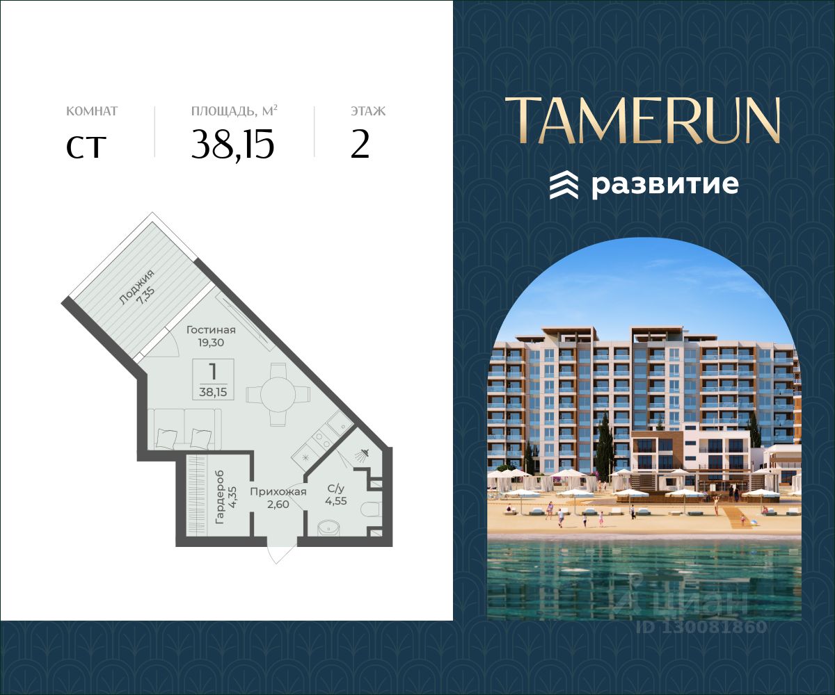 В продаже s комнатный апартамент площадью 38.15 кв. м, без отделки. Апартамент расположен в апарт-комплексе Tamerun от ГК "Развитие".
