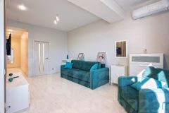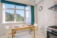 Из окон открывается боковой вид на море, боковой вид на горы и фронтальный вид на зелёный район, застроенный виллами. Квартира расположена на первом этаже, но первый этаж высокий. Под окнами огромная клумба, в которой высажены красно-книжные деревья и реликтовые многолетние кустарники. Клумба шириной 4 метра придаёт квартире дополнительное пространство. Если в клумбе высадить 4-5 пальм вид из окон на тропическую клумбу будет создавать дополнительное ощущение тропиков. В квартире выполнен новый ремонт, завершили делать ремонт летом 2025 года. Квартира полностью укомплектована мебелью и техникой, необходимой для комфортабельного проживания. В подъезде очень длинный коридор шириной в 2,8 метра, в котором можно установить встроенные корпусные шкафы как дополнительная система хранения вещей.