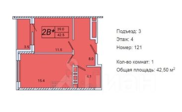 Площадь: 42,9 м², на 4 эт./8 эт.дома, пом. 121