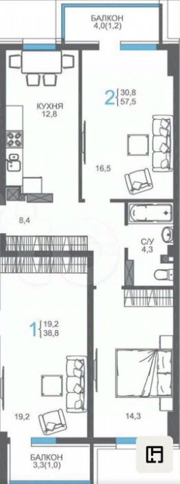 Общая площадь квартиры: 57,5 кв., м.