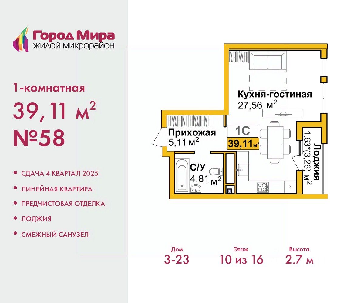 1-комн. квартира от застройщика с предчистовой отделкой в ЖМ "Город Мира" на 10 этаже. Общая площадь: 39.11 кв.м., жилая: 22.56 кв.м., площадь кухни: 5 кв.м. Все окна выходят на одну сторону. В квартире одна лоджия, один совмещенный санузел. Высота потолков 2.7 м.