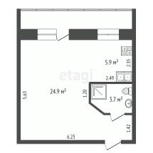 Площадь квартиры составляет 33,5 квадратных метров, жилая площадь - 18 квадратных метра.