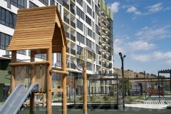 - Территория комплекса озеленена и благоустроена: во дворах размещены спортивные и детские площадки, предусмотрены зоны отдыха, тропа здоровья на склоне горы и смотровая площадка.