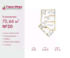 Двухкомнатная квартира от застройщика с предчистовой отделкой в ЖМ "Город Мира" на 4 этаже. Общая площадь: 75.66 кв.м., жилая: 24.96 кв.м., площадь просторной кухни-столовой: 28.91 кв.м. Угловая квартира, идеально подойдет любителям тишины и панорамных видов. В квартире две лоджии, один совмещенный и один раздельный санузел. Высота потолков 2.7 м.