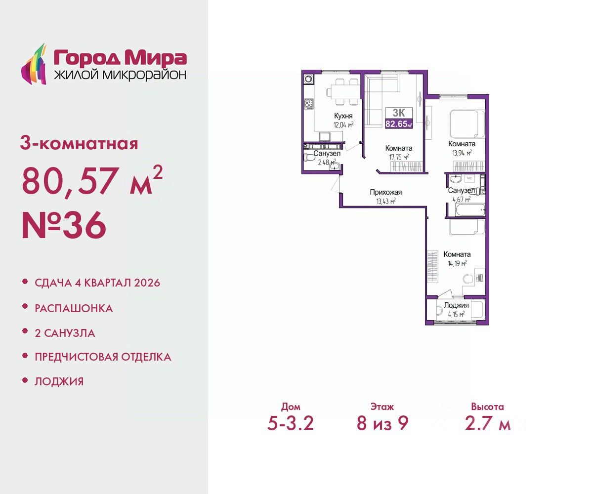 Просторная 3-комн. квартира с предчистовой отделкой в ЖМ "Город Мира" на 8 этаже. Общая площадь: 80.57 кв.м., жилая: 45.88 кв.м., площадь просторной кухни-столовой: 12.04 кв.м. Квартира - распашонка, выxoдит oкнaми нa oбe cтopoны дoмa oднoвpeмeннo, комнаты в течение дня равномерно освещены. В квартире одна лоджия, один совмещенный и один раздельный санузел. Высота потолков 2.7 м.