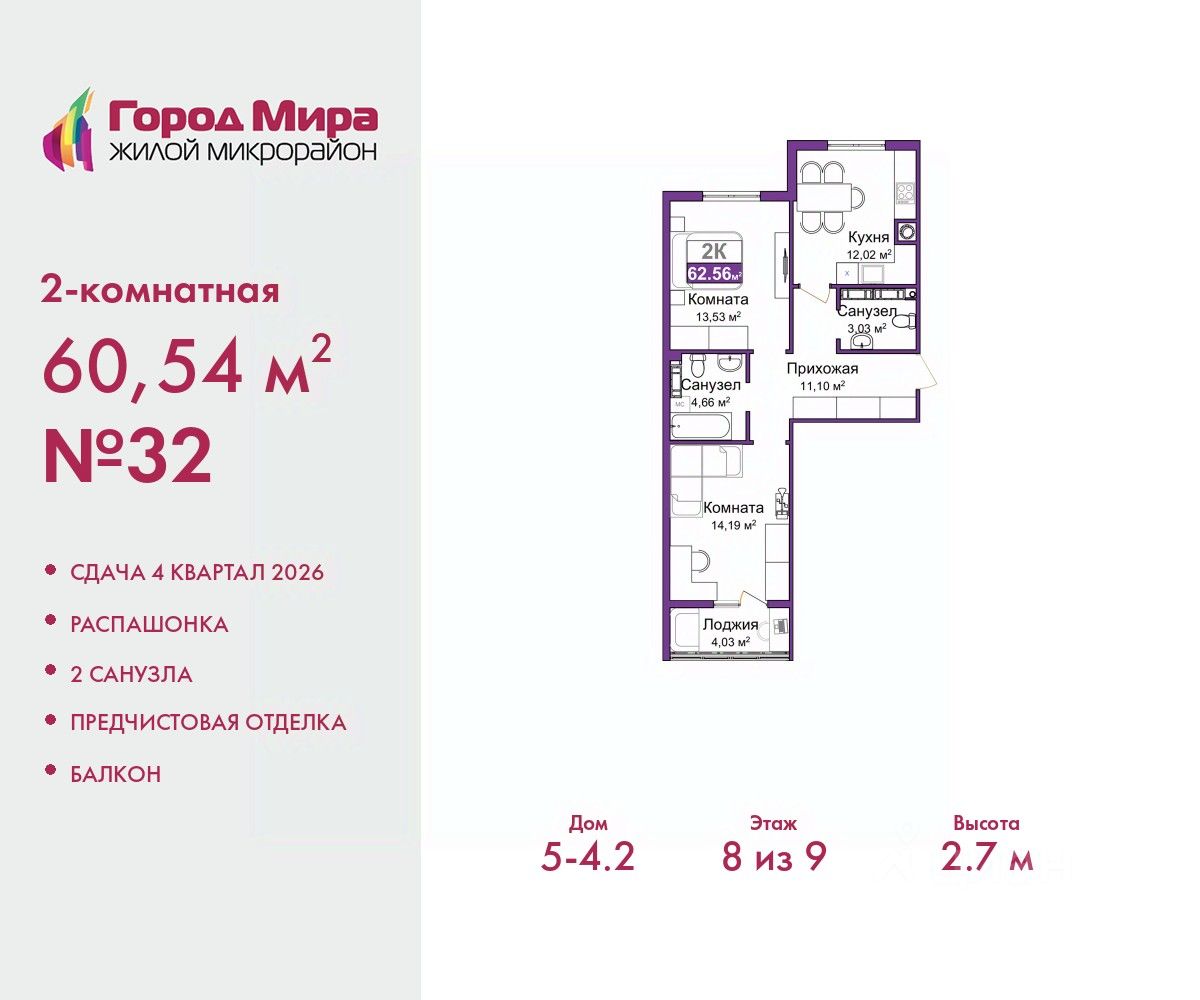 2-комн. квартира с предчистовой отделкой в ЖМ "Город Мира" на 8 этаже. Общая площадь: 60.54 кв.м., жилая: 27.72 кв.м., площадь просторной кухни-столовой: 12.01 кв.м. Квартира - распашонка, без проходных комнат, окна выходят на paзные стороны дома. В квартире один балкон, один совмещенный и один раздельный санузел. Высота потолков 2.7 м.