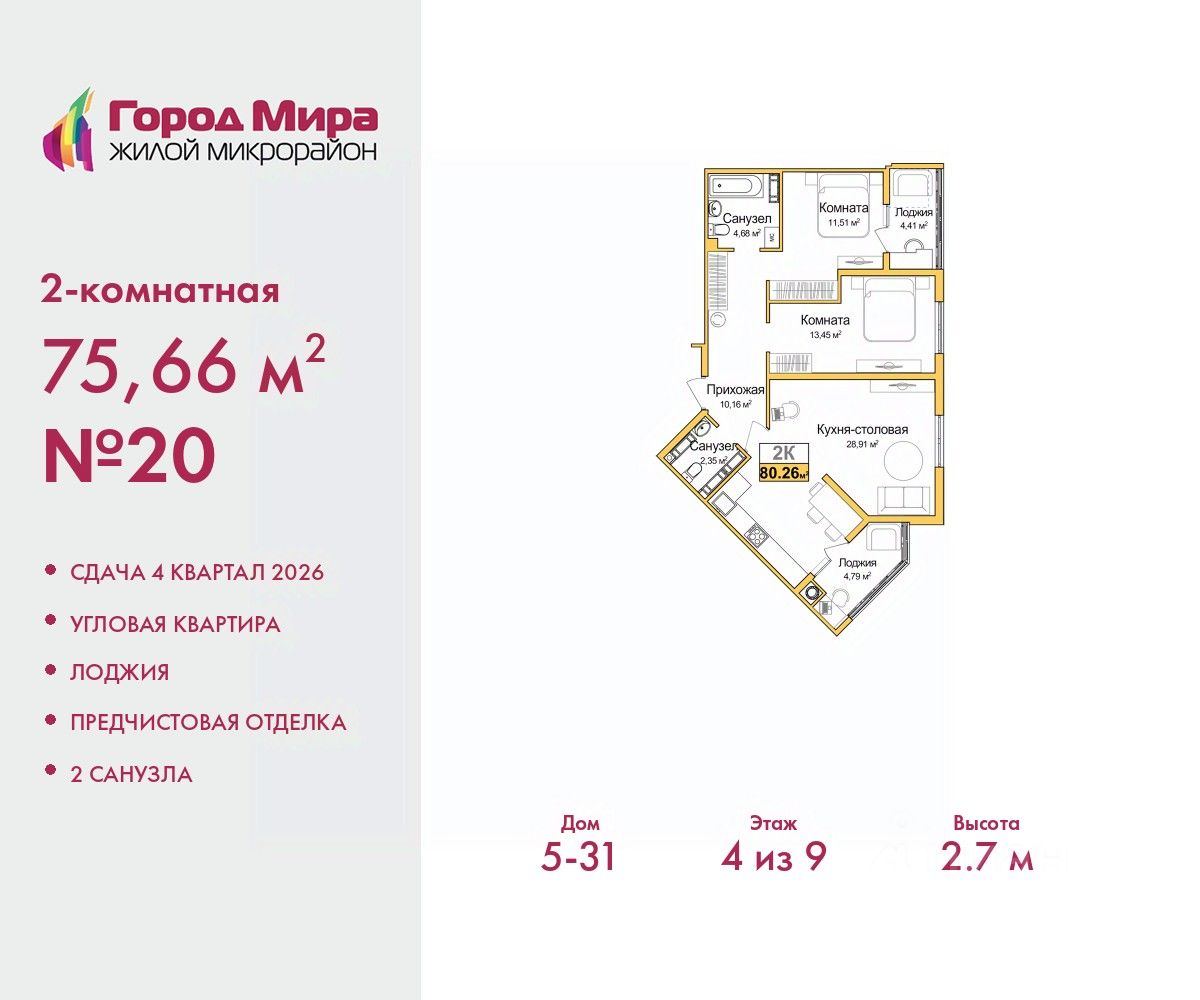 Продается 2-комн. квартира от застройщика с предчистовой отделкой в ЖМ "Город Мира" на 4 этаже. Общая площадь: 75.66 кв.м., жилая: 24.96 кв.м., площадь просторной кухни-столовой: 28.91 кв.м. Квартира угловая, окна oбecпeчивaют paвнoмepнoe ocвeщeниe в тeчeниe дня. В квартире две лоджии, один совмещенный и один раздельный санузел. Высота потолков 2.7 м.