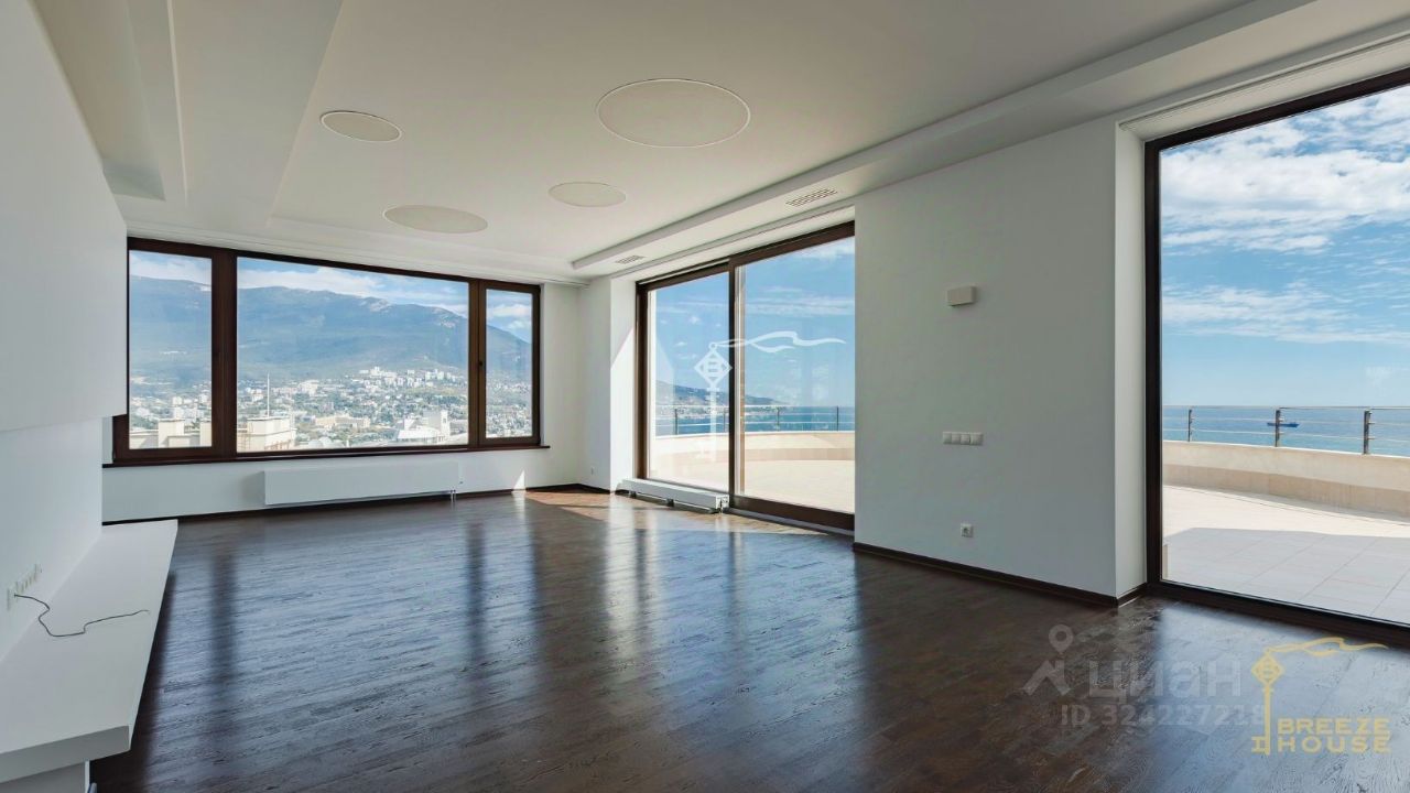 Панорамные окна от пола до потолка. Благодаря такому остеклению солнечные лучи наполняют пространство светом, а красивый вид на живописный природный и архитектурный ландшафт Ялты сделает ваш интерьер уникальным.