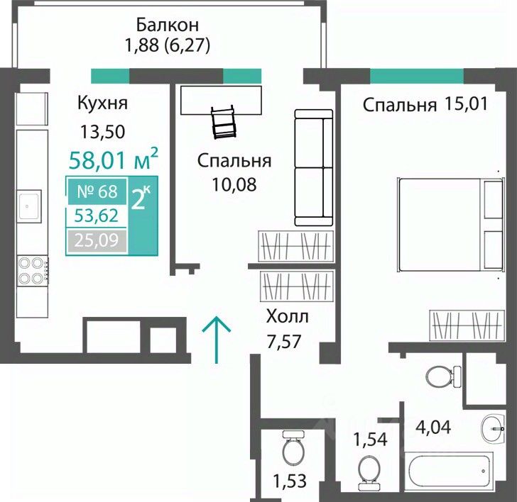 Продаётся 2-комнатная квартира в строящемся доме (ЭТАП 1, СЕКЦИИ А1, А2, А3), срок сдачи: III-кв. 2028, общей площадью 53.62 кв.м., на 7 этаже. Новый жилой комплекс "Семейный квартал ПРОПОЛИС" от застройщика "Монолит" расположен по адресу: Республика Крым, Симферопольский район, с. Мирное, ул. Учительская