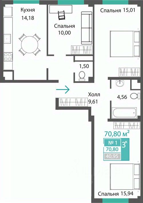 Продаётся 3-комнатная квартира в строящемся доме (ЭТАП 1, СЕКЦИИ А1, А2, А3), срок сдачи: III-кв. 2028, общей площадью 70.8 кв.м., на 1 этаже. Новый жилой комплекс "Семейный квартал ПРОПОЛИС" от застройщика "Монолит" расположен по адресу: Республика Крым, Симферопольский район, с. Мирное, ул. Учительская