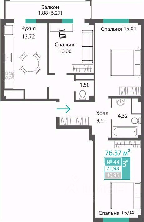Продаётся 3-комнатная квартира в строящемся доме (ЭТАП 1, СЕКЦИИ А1, А2, А3), срок сдачи: III-кв. 2028, общей площадью 71.98 кв.м., на 2 этаже. Новый жилой комплекс "Семейный квартал ПРОПОЛИС" от застройщика "Монолит" расположен по адресу: Республика Крым, Симферопольский район, с. Мирное, ул. Учительская