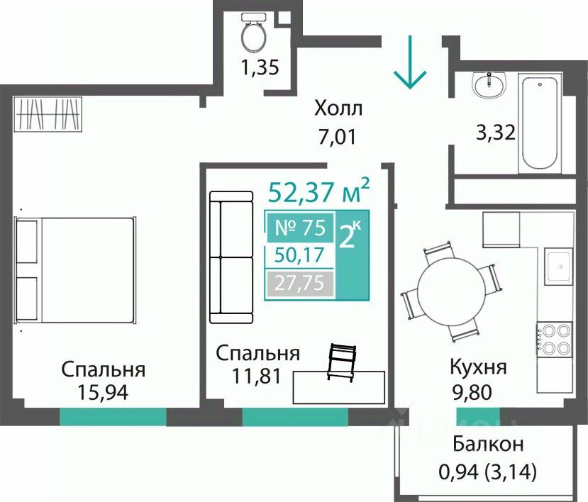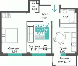 Продаётся 2-комнатная квартира в строящемся доме (ЭТАП 1, СЕКЦИИ А1, А2, А3), срок сдачи: III-кв. 2028, общей площадью 50.17 кв.м., на 5 этаже. Новый жилой комплекс "Семейный квартал ПРОПОЛИС" от застройщика "Монолит" расположен по адресу: Республика Крым, Симферопольский район, с. Мирное, ул. Учительская