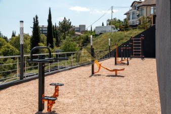 - Для резидентов на территории предусмотрены открытый инфинити-бассейн с аква-баром, детский бассейн, воркаут-зоны, роллердром, скалодром, памп-трек, велосипедные и беговые дорожки, поле для мини-футбола и волейбола, зоны барбекю, лаунж-зоны, смотровая площадка и амфитеатр.