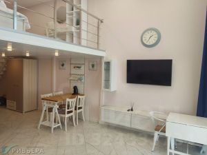 Высота потолков - 5м, часть квартиры разделена на два уровня, на верхнем располагаются две спальни, одна маленькая, а вторая видовая на балконе второго этажа с видом на Аюдаг и Море.