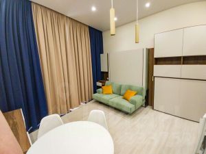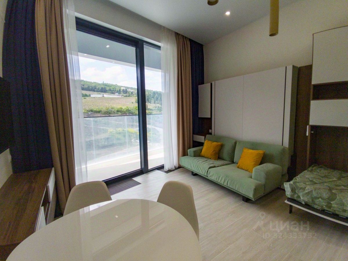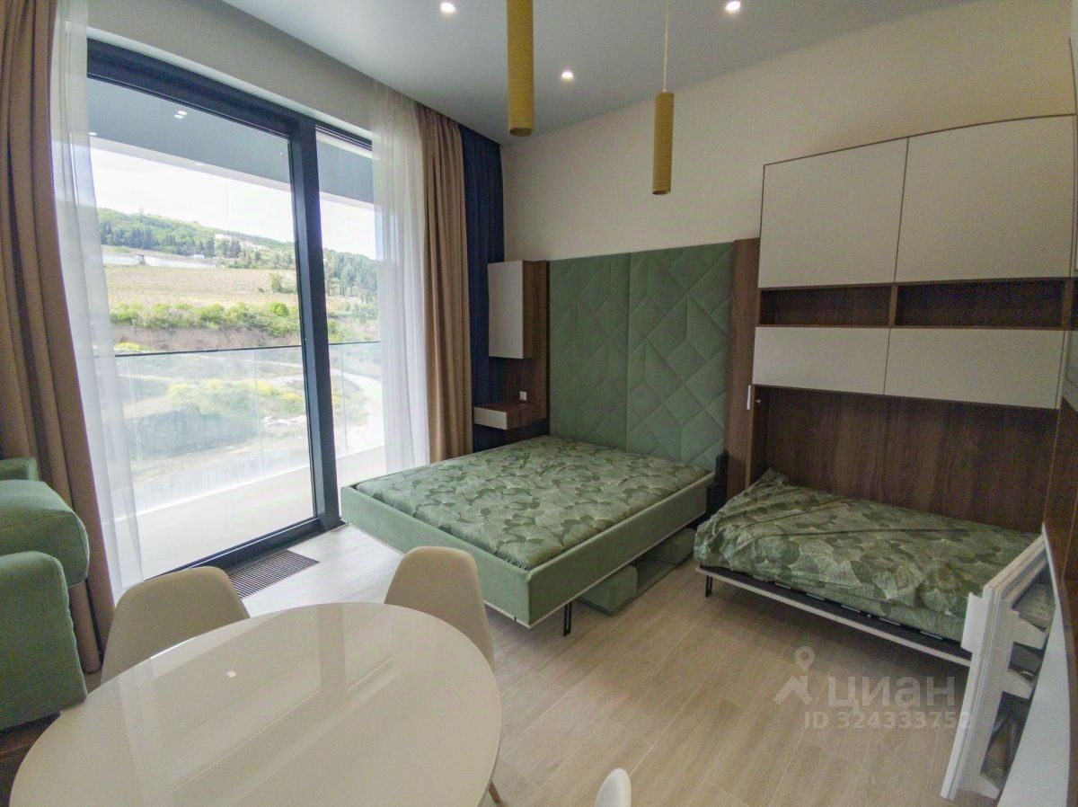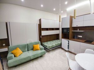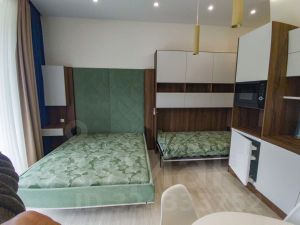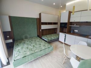 Продается апартамент в Комплексе Аю-Даг. Апартамент студия, с хорошим евроремонтом и качественной мебелью. Двуспальная кровать и диван выполнены по технологии транформер, легко и удобно складываются в стену превращаясь в комфортный диванчик и освобождая пространство. В прихожей вместительный шкаф вдоль всей стены плавно переходящий во встроенную мебель гостиной. Просторный санузел с большой просторной душевой кабиной оформлен красивой подсветкой, столешница из дерева под раковиной чашей, унитаз инсталляция встроенный в стену, с теплыми полами. Установлена стиральная машина. Мощная система кондиционирования. В кухонном гарнитуре встроенная кухонная техника: духовка, холодильник, варочная поверхность. Парящие потолки с подсветкой.