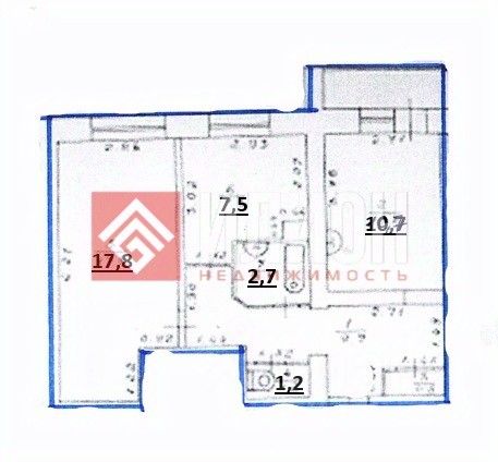 - Общая площадь: 49,9 м² (кухня 10,7 м², гостиная 17,8 м², спальня 7,5 м²);