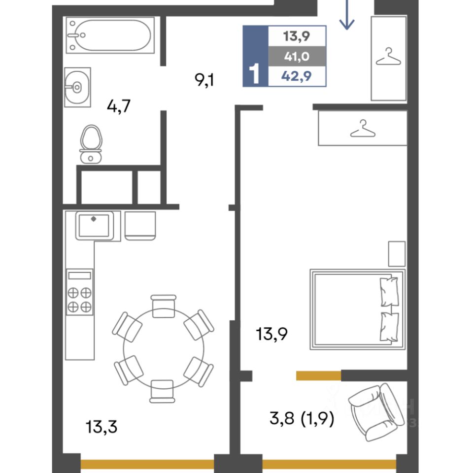 Общая площадь42,9 м²