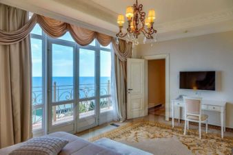 Апартаменты расположены на высоком этаже и имеют панорамный вид на Черное море и живописные крымские горы. Планировка включает просторную кухню-гостиную, три спальни с выходом на балкон, два санузла с термальной зоной и просторную террасу.