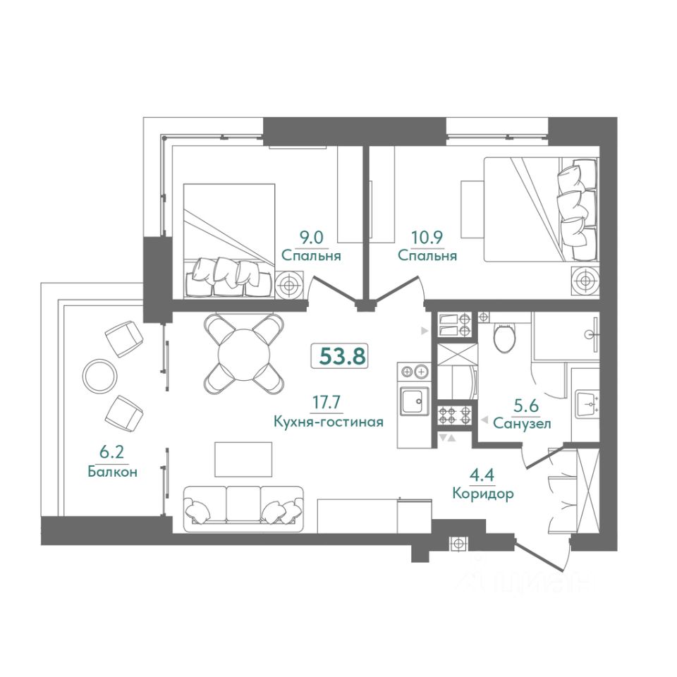 Продается квартира площадью 53.8м² в жилом комплексе Сады Киммерии на 2 этаже стоимостью 18 561 000 рублей, с высокими потолками 3.2 метра
