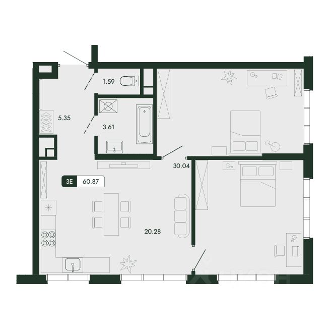 Продаётся 2-комнатная квартира в строящемся доме (дом 2), срок сдачи: III-кв. 2027, общей площадью 60.87 кв.м., на 1 этаже.