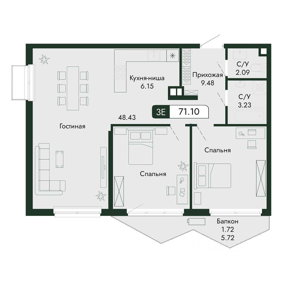 Продаётся 4-комнатная квартира в строящемся доме (дом 2), срок сдачи: III-кв. 2027, общей площадью 71.1 кв.м., на 2 этаже.
