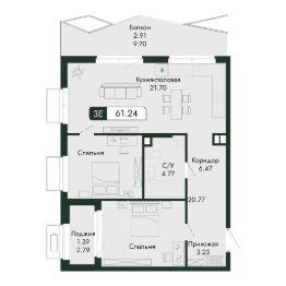 Продаётся 3-комнатная квартира в строящемся доме (дом 2), срок сдачи: III-кв. 2027, общей площадью 61.24 кв.м., на 2 этаже.