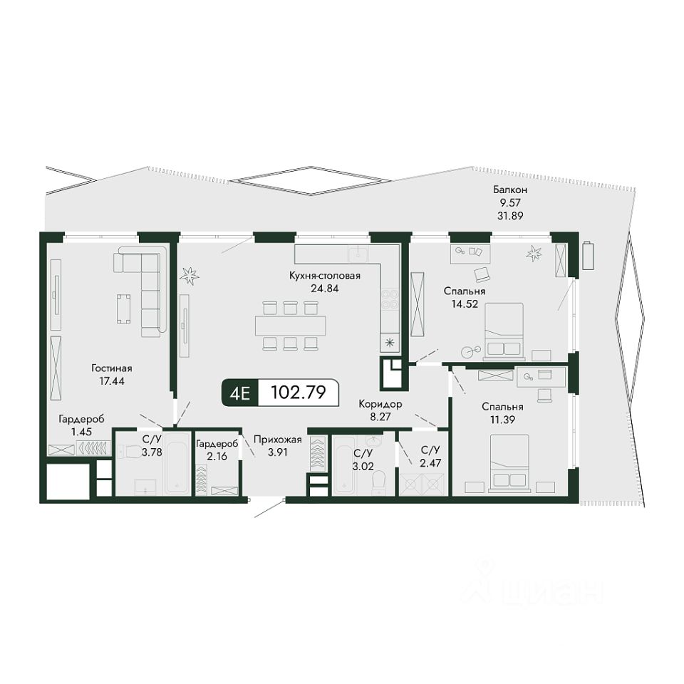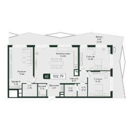 Продаётся 4-комнатная квартира в строящемся доме (дом 2), срок сдачи: III-кв. 2027, общей площадью 102.79 кв.м., на 4 этаже.