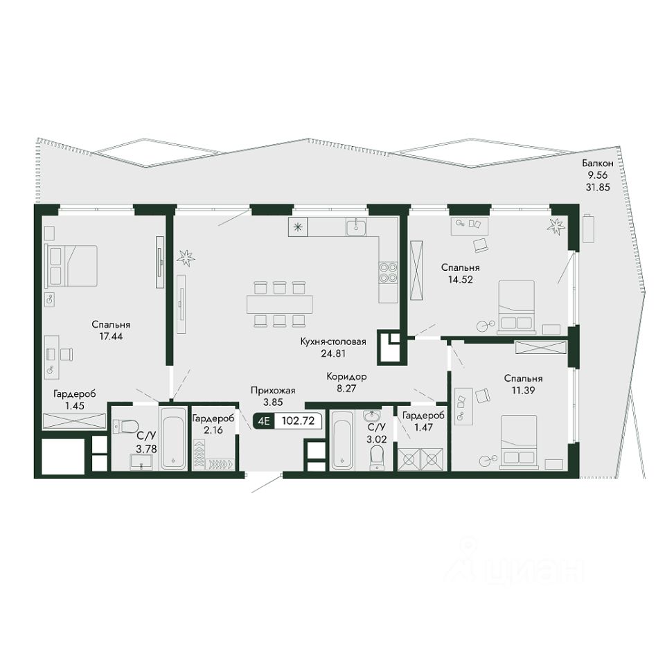 Продаётся 4-комнатная квартира в строящемся доме (дом 2), срок сдачи: III-кв. 2027, общей площадью 102.72 кв.м., на 7 этаже.