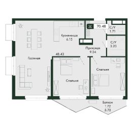 Продаётся 4-комнатная квартира в строящемся доме (дом 2), срок сдачи: III-кв. 2027, общей площадью 70.48 кв.м., на 8 этаже.