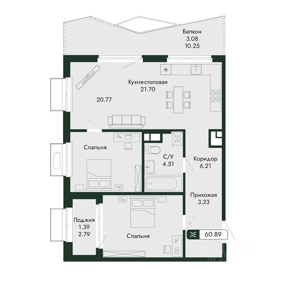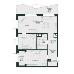 Продаётся 3-комнатная квартира в строящемся доме (дом 2), срок сдачи: III-кв. 2027, общей площадью 60.89 кв.м., на 11 этаже.