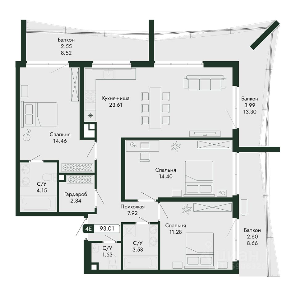 Продаётся 4-комнатная квартира в строящемся доме (дом 2), срок сдачи: III-кв. 2027, общей площадью 93.01 кв.м., на 2 этаже.