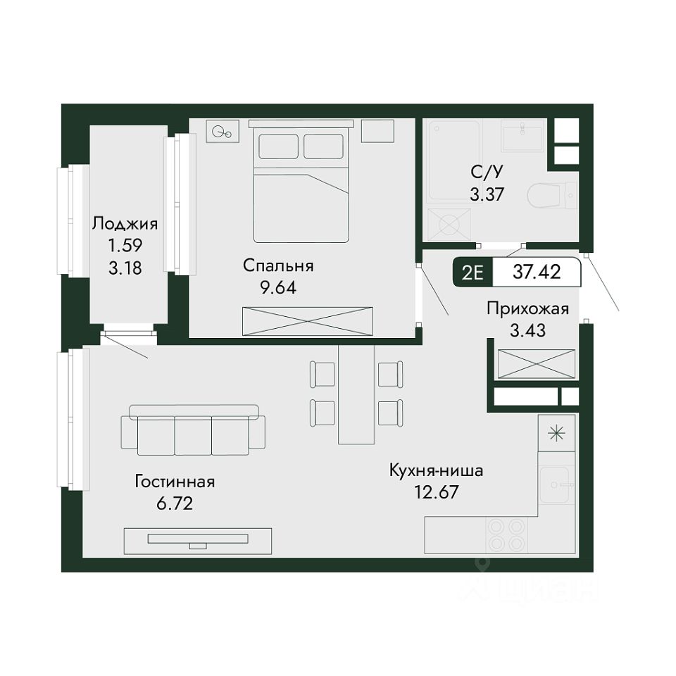 Продаётся 2-комнатная квартира в строящемся доме (дом 2), срок сдачи: III-кв. 2027, общей площадью 37.42 кв.м., на 3 этаже.