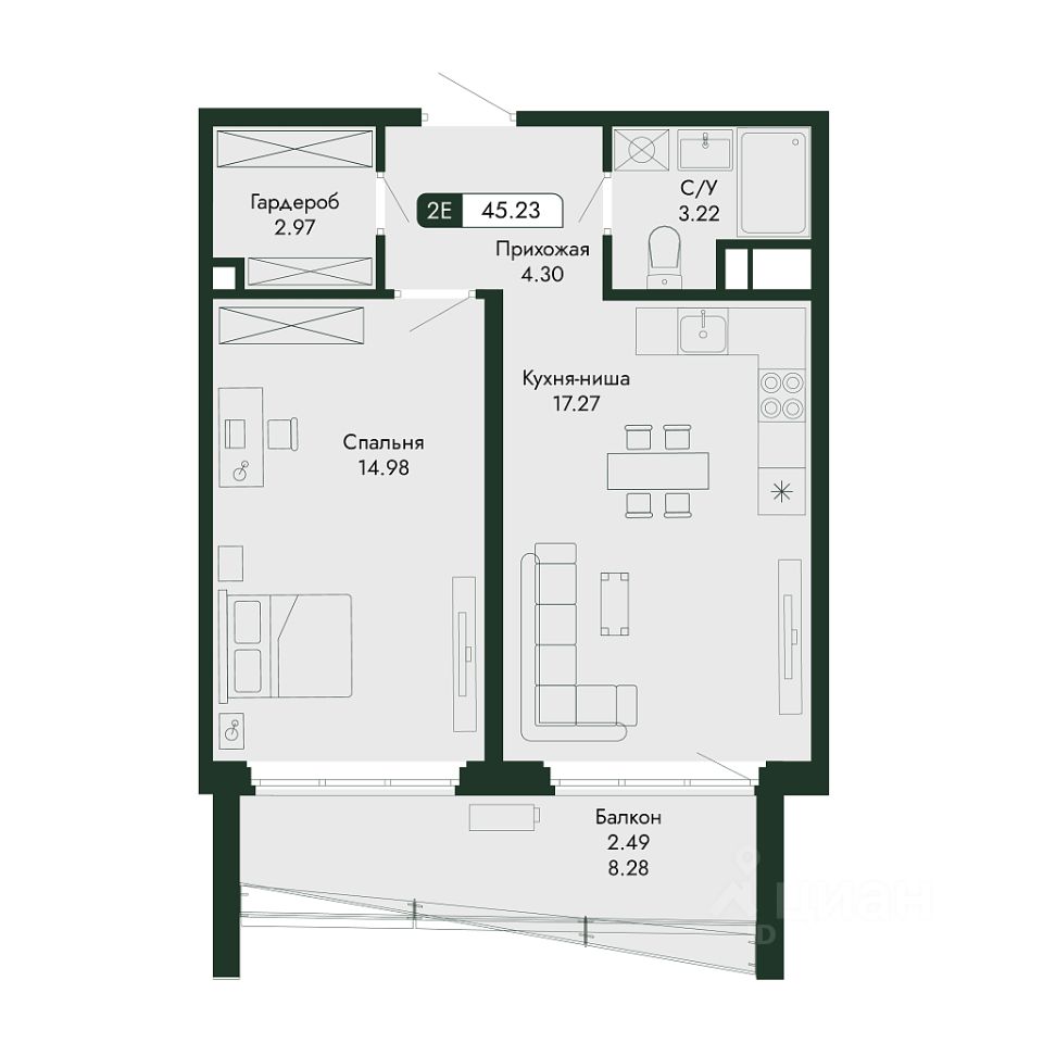 Продаётся 1-комнатная квартира в строящемся доме (дом 2), срок сдачи: III-кв. 2027, общей площадью 45.23 кв.м., на 6 этаже.